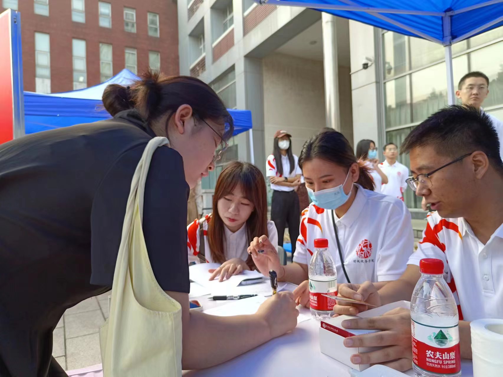 博学楼门前,是财税学院的新生报到处。新生们在志愿者的引导下,来到博学楼门前进行报到注册。为了维持现场秩序、提高工作效率,学院按照学历层次设置了研究生和本科生两个分区报到处,并为每个班级配备了班主任助理来协助完成整个报道流程,新生用很短的时间即可完成所有手续,大大提高了新生报道注册的效率。学院也为每个新生准备了“新生大礼包”作为入学第一天的礼物。