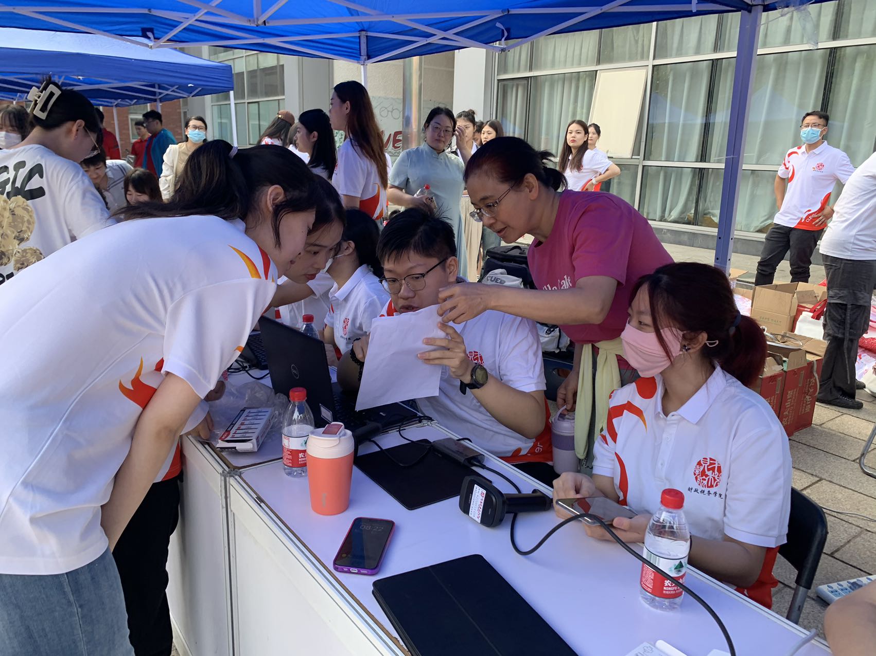 为做好此次迎新工作,学院提前做了大量的准备。早上7时许,学院的领导、老师和志愿者们就已经各就各位,忙碌起来。分团委、学生会、研究生会的同学们早早地来到博学楼门前,布置现场、调试电脑、整理材料、安排志愿者进行点对点引导服务,耐心等待第一位小萌新的到来。