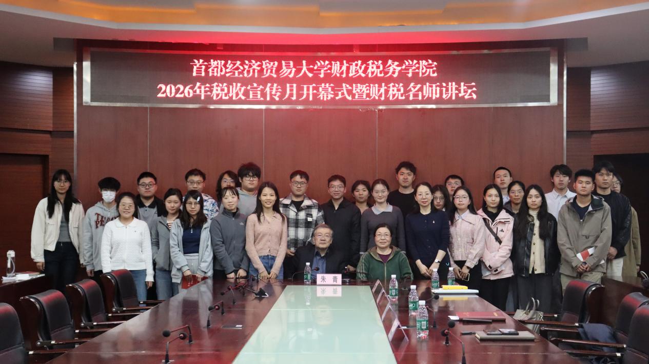 4月1日,首都经济贸易大学财政税务学院税收宣传月开幕式暨财税名师讲坛在博纳楼五层第七会议室举行。本次讲座邀请学院杰出校友、中国人民大学朱青教授作题为“‘十五五’期间税制改革”的专题讲座。学院党委副书记张馨予主持活动。